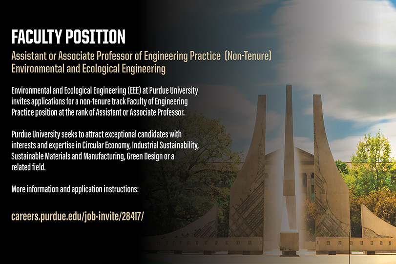 Environmental and Ecological Engineering (EEE) at Purdue University invites applications for a non-tenure track Faculty of Engineering Practice position at the rank of Assistant or Associate Professor. Purdue University seeks to attract exceptional candidates with interests and expertise in Circular Economy, Industrial Sustainability, Sustainable Materials and Manufacturing, Green Design or a related field.