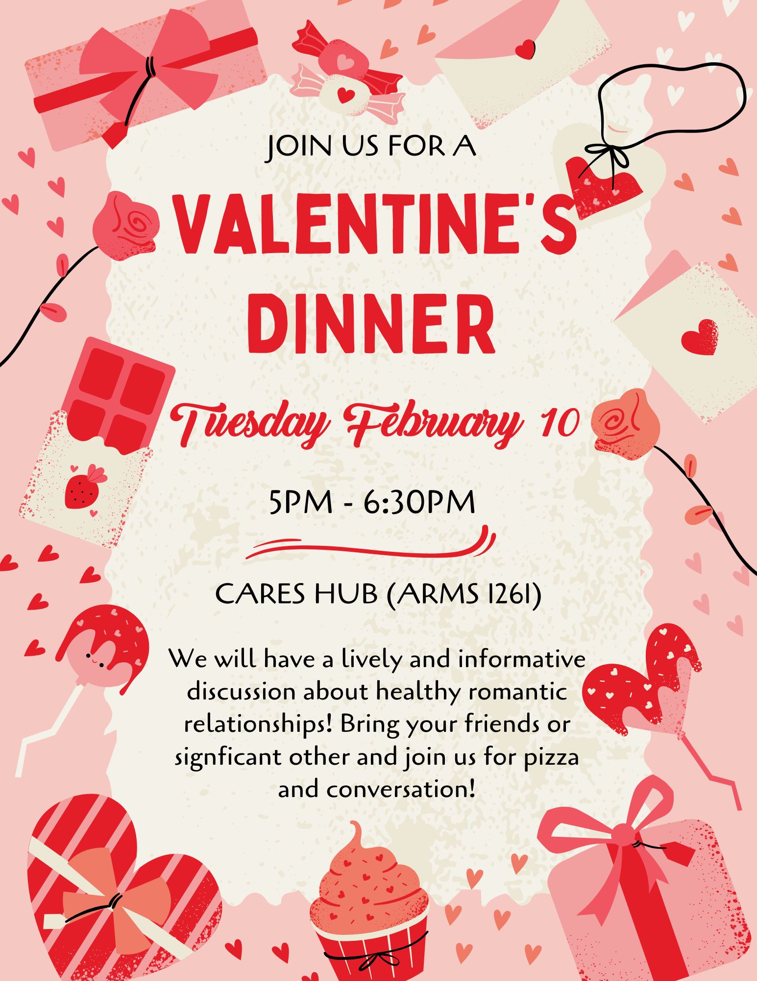 With that in mind, CARES is hosting a Valentine's dinner in the CARES Hub on 2/10 from 5-6:30 pm. We'll be engaging in a lively discussion about healthy romantic relationships including red, yellow, and green flags! Please see the attached flyer!