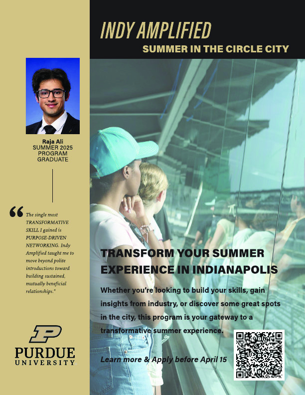 Are you planning an internship or similar experience in Indianapolis this summer? Are you ready to make the most of your summer in the city? Apply today for Indy Amplified: Summer in the Circle City, a summer program designed to enhance your professional journey. Over the course of 6 weeks, you'll engage in evening sessions focused on professional development, networking, and exploring the Circle City! Connect with Purdue alumni, industry professionals, and other Purdue interns while exploring the vibrant opportunities Indianapolis has to offer. Whether you're looking to build your skills, gain insights from industry, or discover some great spots in the city, this program is your gateway to a transformative summer experience.