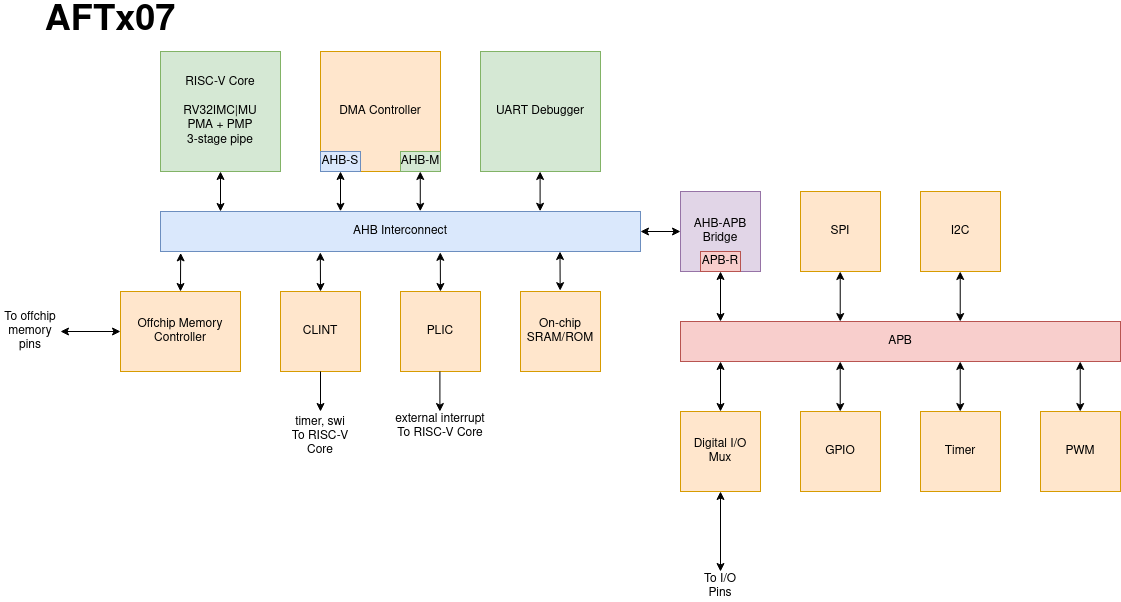Goal: AFTx01 and AFTx02 were the team’s first SoC tape-outs. Both chips share the same architecture, and the bus structure was adopted by all subsequent designs.