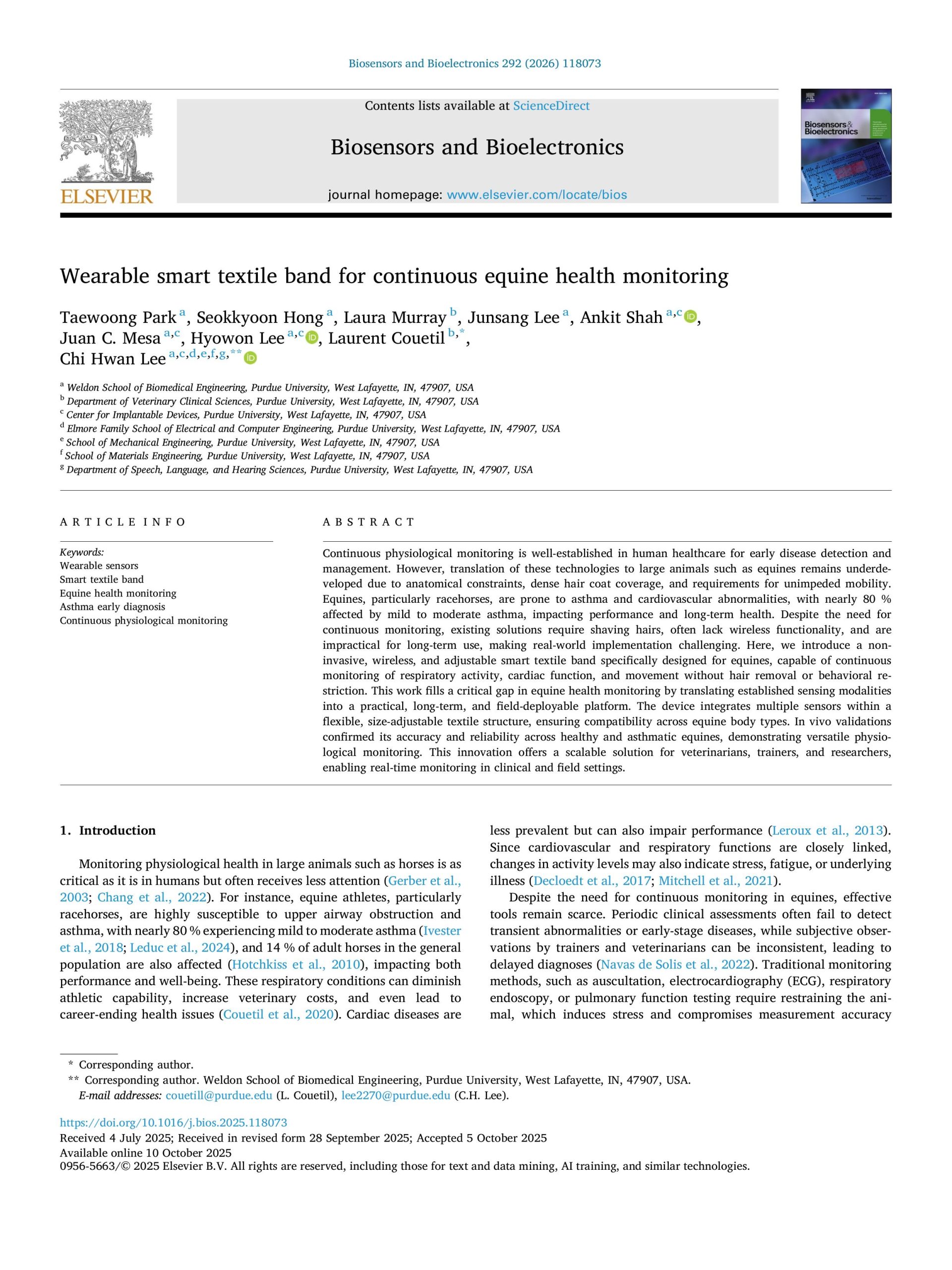 S. Hong, T. Park, Y. Lee, J. Mesa, T. Yu, Y. Ji, J. Lee, J. Jeong, S. Kang, D. Kim, Y. Kim, H. Lee, R. Surowiec, L. Santos, C. H. Lee, “Smart garment for continuous respiration monitoring in canines”