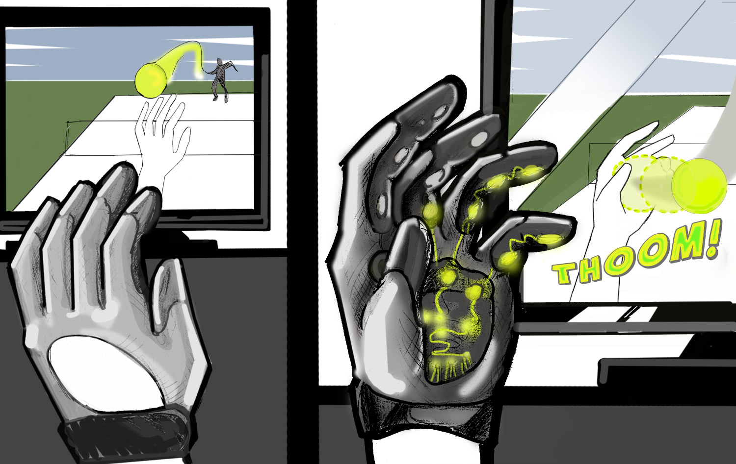 Abstract: We present a novel, low-power and untethered pneumatic haptic device, namely the ACTIVE-Hand, for realistic and real-time 3D gaming experience. Currently, body-motion based 3D gaming systems primarily use visual feedback to provide partly immersive gaming experiences. Tactile feedback systems in Virtual Reality provide immersion with high tactile resolution, but they are expensive and difficult to setup and calibrate. The conceptually economical modular design of the ACTIVE-Hand allows easily configurable tactile feedback as per application requirements. Contrary to commercial systems like Wiiâ„¢ which provide global vibrations as a proxy for synthetic tactile feedback, the ACTIVE Hand is comparably lightweight, yet scalable to meet localized tactile resolution requirements. The ACTIVEHand provides controllable pulses for dynamic virtual interactions such as pressing virtual buttons and hitting moving virtual balls. We successfully demonstrate the paradigm of dynamic tactile interactions in virtual environments through a 3D Pong game by integrating the ACTIVE-Hand with Kinectâ„¢ camera.
