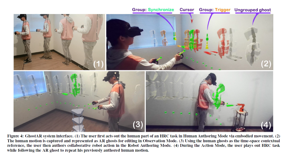 We present GhostAR, a time-space editor for authoring and acting Human-Robot-Collaborative (HRC) tasks in-situ. Our system adopts an embodied authoring approach in Augmented Reality (AR), for spatially editing the actions and programming the robots through demonstrative role-playing. We propose a novel HRC workflow that externalizes user’s authoring as demonstrative and editable AR ghost, allowing for spatially situated visual referencing, realistic animated simulation, and collaborative action guidance. We develop a dynamic time warping (DTW) based collaboration model which takes the real-time captured motion as inputs, maps it to the previously authored human actions, and outputs the corresponding robot actions to achieve adaptive collaboration. We emphasize an in-situ authoring and rapid iterations of joint plans without an offline training process. Further, we demonstrate and evaluate the effectiveness of our workflow through HRC use cases and a three-session user study.