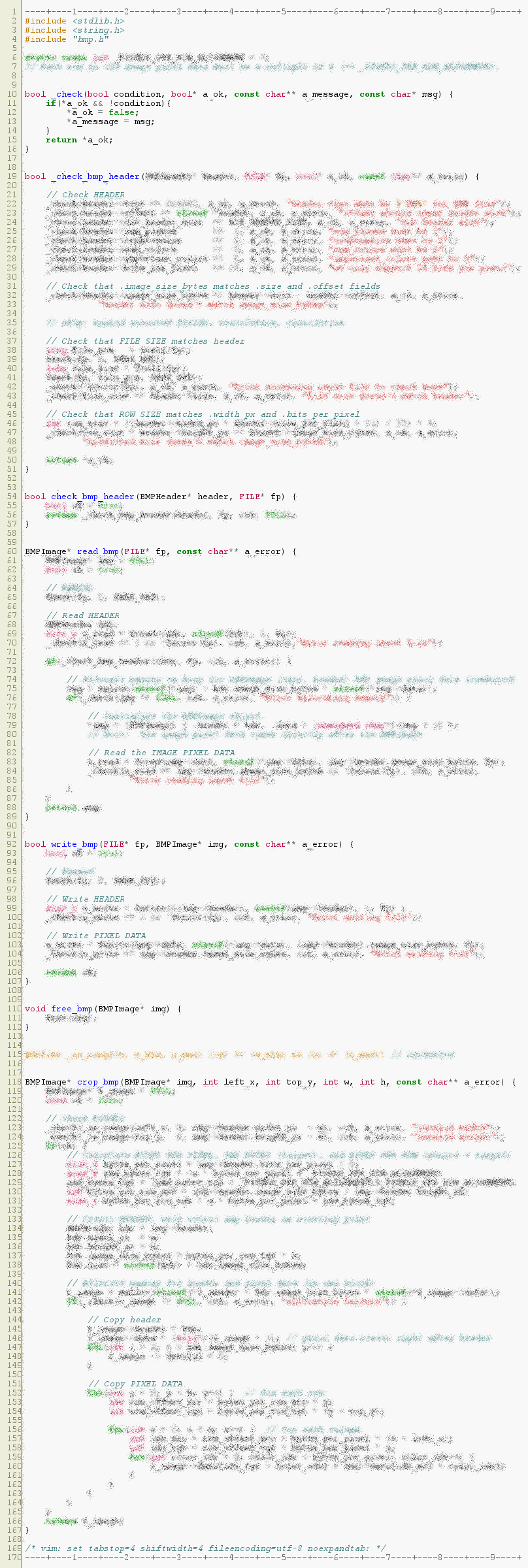 | HW12 | ∞ | ∞ | test_bmp.c | No length threshold. Tests should be readable and commented. Use helpers to reduce redunancy, where practical. |