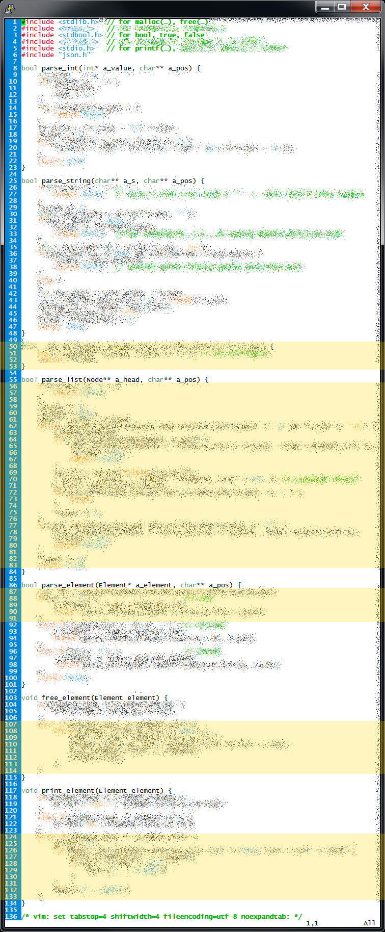 Here's a start. (We may add to this at some point.)// OK TO COPY / ADAPT this snippet---but ONLY if you understand it completely. // ⚠ Do not copy blindly. // // This test is nowhere near adequate on its own. It is provided to illustrate how to // use helper functions to streamline your test code. #include <stdio.h> #include <stdlib.h> #include "json.h" #include "miniunit.h" static int _test_parse_int_valid() { mu_start(); //────────────────────────────────────────────────────── int result; // will be initialized in parse_int(…) char* input = "0"; char const* pos = input; bool is_success = parse_int(&result, &pos); mu_check(is_success); // because the input is valid mu_check(pos == input + 1); mu_check(result == 0); //────────────────────────────────────────────────────── mu_end(); } static int _test_parse_int_invalid() { mu_start(); //────────────────────────────────────────────────────── int result; // will be initialized in parse_int(…) char* input = "A"; char const* pos = input; bool is_success = parse_int(&result, &pos); mu_check(!is_success); // because the input is invalid mu_check(pos == input); // failure should be at the first character in the input //────────────────────────────────────────────────────── mu_end(); } int main(int argc, char* argv[]) { mu_run(_test_parse_int_valid); mu_run(_test_parse_int_invalid); return EXIT_SUCCESS; }