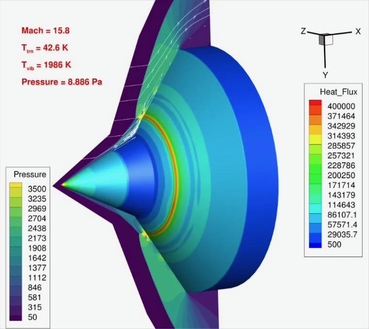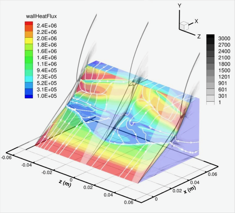 Shock wave boundary layer interactions (SWBLIs) occur as an outcome of the interaction of external shock waves with boundary layers. These interactions, commonly seen in deflected control surfaces and inlets of hypersonic vehicles, can cause unsteady oscillations, buffeting, and localized high heating and pressure regions with distinct degrees of thermochemical nonequilibrium. Intense localized heating and pressure load could destroy vehicles, especially when an external shock impinges on a boundary at hypersonic speed, as can be seen below. Therefore, accurate modeling and prediction of SWBLIs are essential for cost-effective design process purposes of hypersonic vehicles to avoid performance penalties or failure. These multiscale interactions include modeling flow separation and viscous effects, temporal characteristics and unsteadiness, and chemical reactions and internal energies due to the high-enthalpy nature of hypersonic flows.