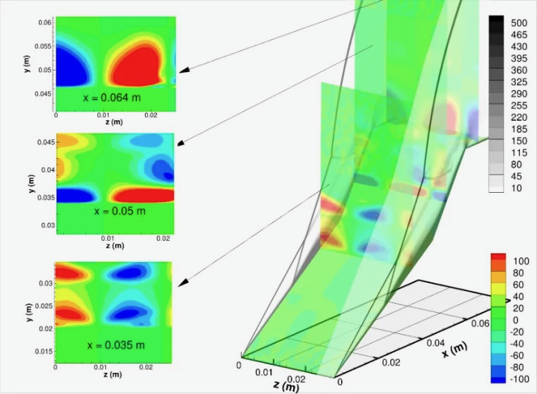 Impinging a shock induces an adverse pressure gradient on the boundary layer, possibly a flow separation, as shown in the figure. These interactions are susceptible to two- and three-dimensional instabilities and coherent vortical structures such as Kelvin-Helmholtz and Görtler-type in the vicinity of shear layers, to name a few. These instabilities have substantial effects on the surface heating and temporal characteristics of the flows, as shown in figures. Therefore, investigations of SWBLIs using computational fluid dynamics (CFD) approaches are essential for cost-efficient design purposes. To this end, the Hanquist Group uses continuum flow solvers for high-density applications as well as a high-fidelity direct simulation Monte Carlo (DSMC) approach for rarefied flow modeling.