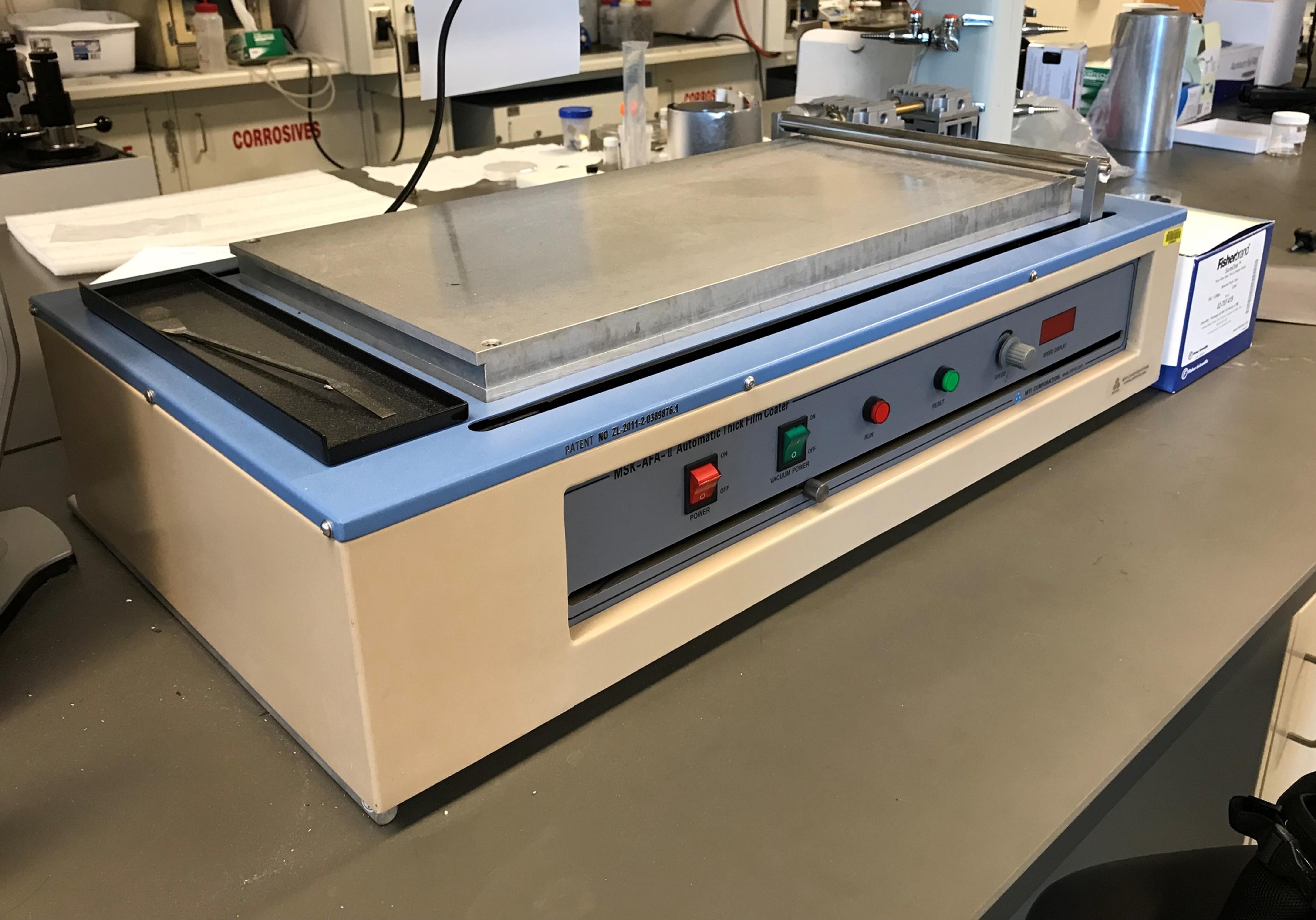 ![]() Automatic Film Coater Large Automatic Film Coater designed to produce films with consistent thickness by using micrometer adjustable applicators or fixed thickness applicators. It has a unique driving system to produce a smooth coating on all types of materials. One micrometer adjustable applicator is included for immediate use. |
