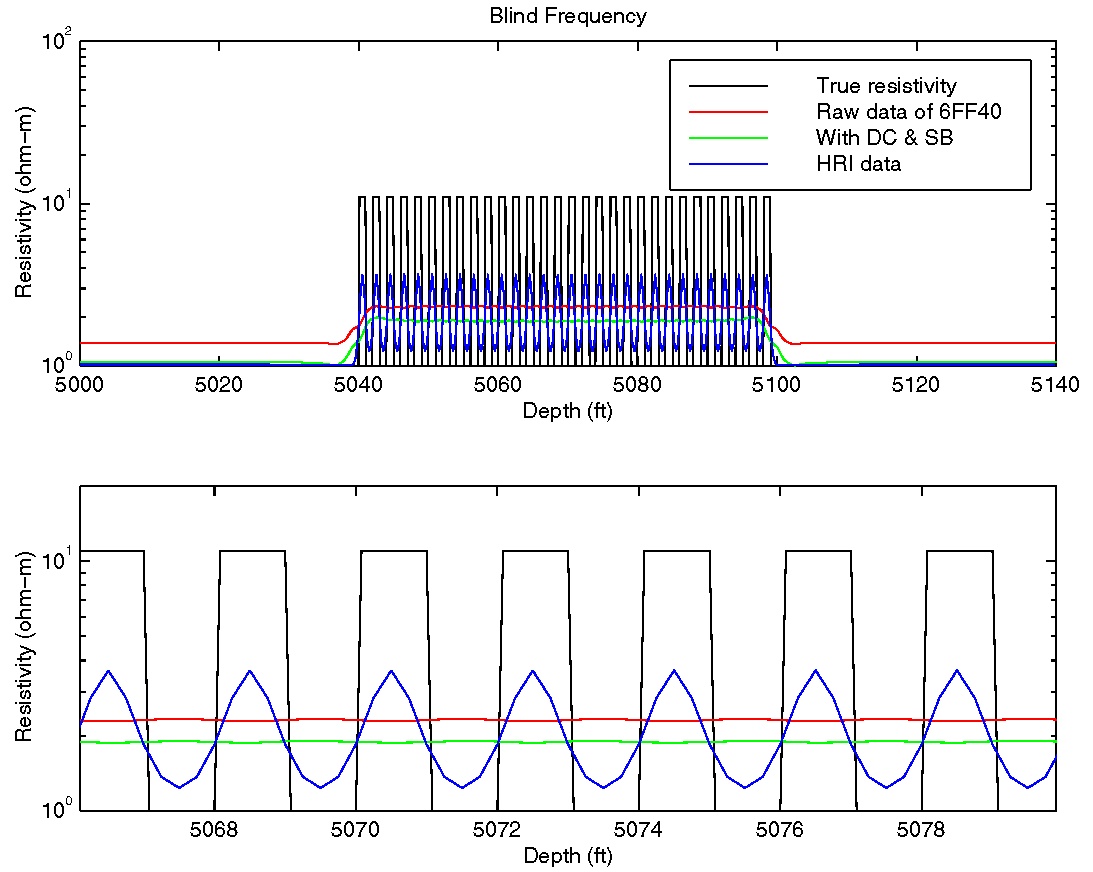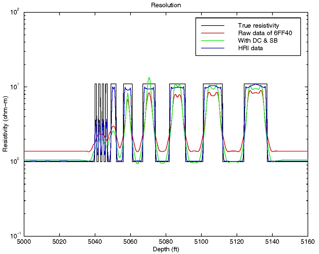Experimental Borehole MeasurementsThe following results show different aspects of the response of experimental logging tools used for petrol extraction. These tests are performed with a known underground profile of resistivity which is included in all the Figures. The two measurement tools used are Schlumberger's 6FF40 and Halliburton's HRI.